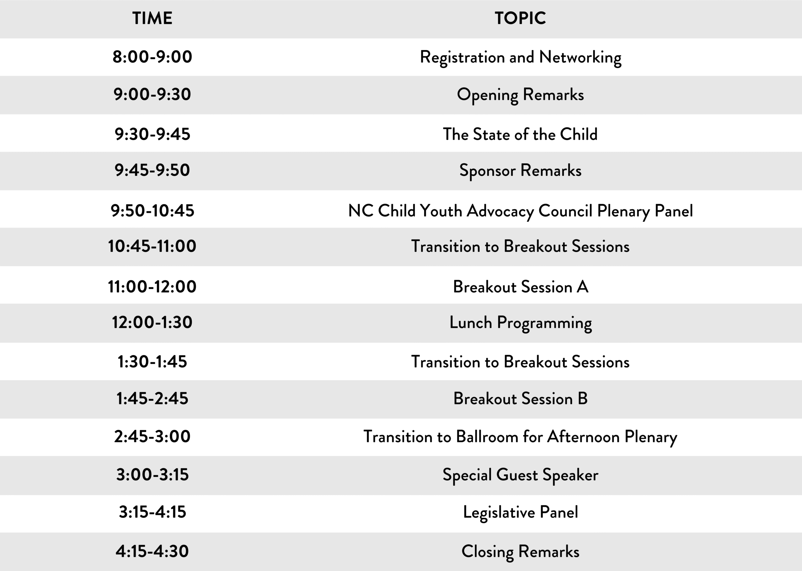 In these sessions, you'll hear from civic, nonprofit, and industry leaders, policymakers, health professionals, advocates, and youth about the critical issues that affect our state's youngest residents. Read more about our breakout sessions here.
